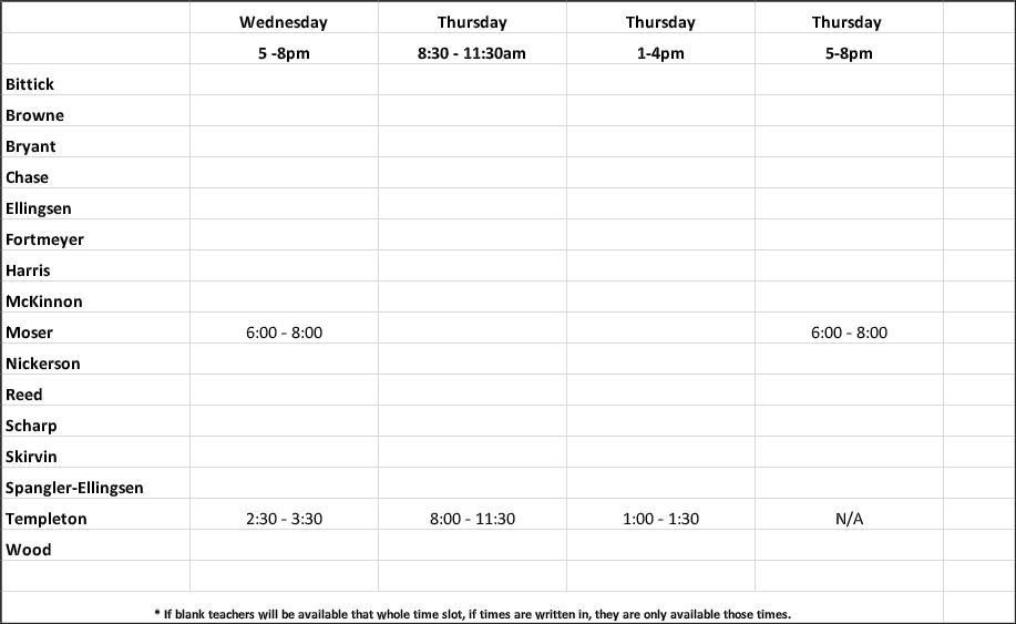Below is a table that explains what time teachers are available for drop in conferences. If you see a specific time in one of the blocks, that is to notify visitors that teachers are only able to meet at that specified time. If the block is blank, that means the teacher is available that whole time.